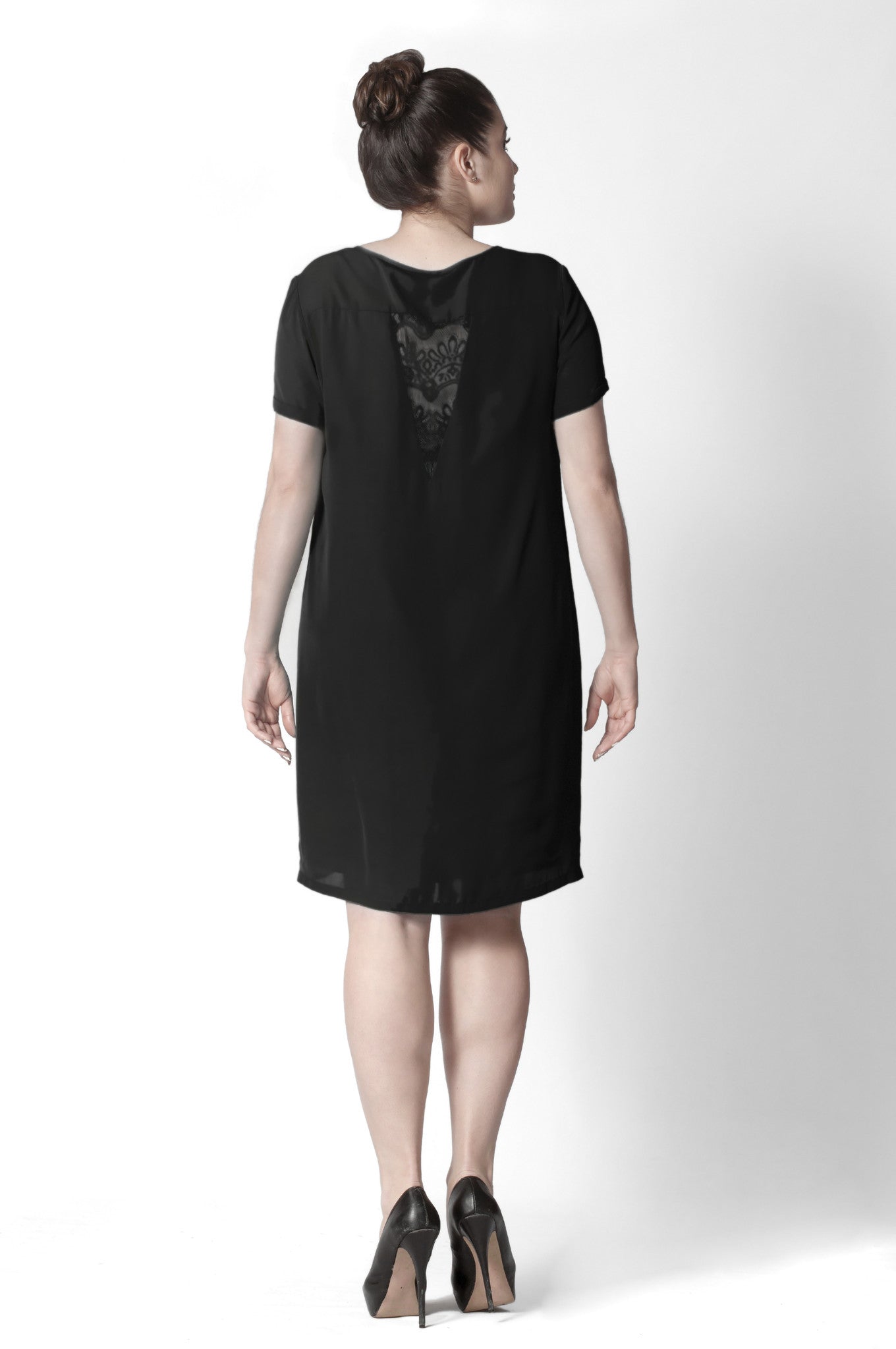 View full details for sizing info. This short sleeve shift dress has a chic relaxed fit, but can be belted as well. There is a lace panel at the bust and a larger one on the back. The short sleeves have a narrow cuff. The dress is fully lined and hits right above the knee. It's the perfect Little Black Dress for a night out or paired with a blazer for work.