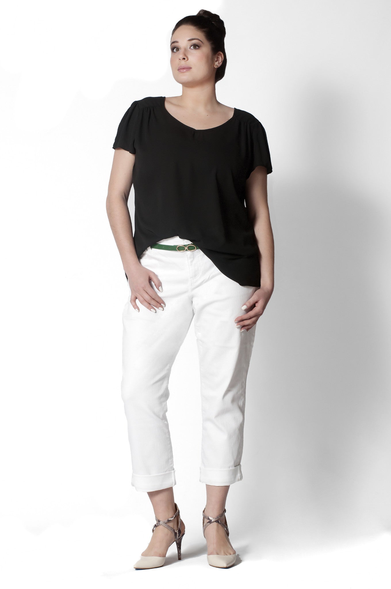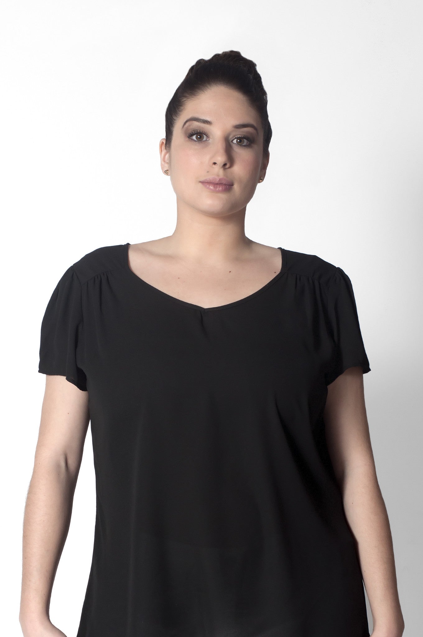 This simple short sleeve v-neck shirt is a great top to upgrade your basic tee for a dressier look. It has a relaxed fit that will work for all body types and will give a casual outfit a more stylish look. Top hits at the hip.