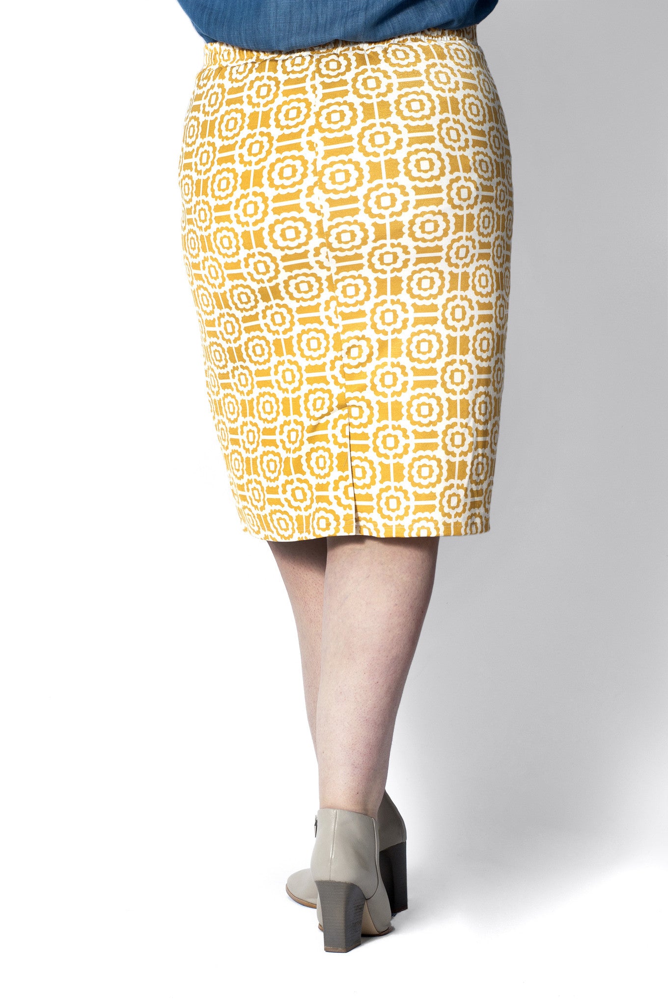 This high waisted geometric printed pencil skirt falls at the knee and is super stretchy to fit all body types. This skirt has a flat waistband in the front and an elastic waist for proper fit in the rear. It is fully lined with a slit in the back. It is very soft material and will be comfortable for a long day at the office or a night out.