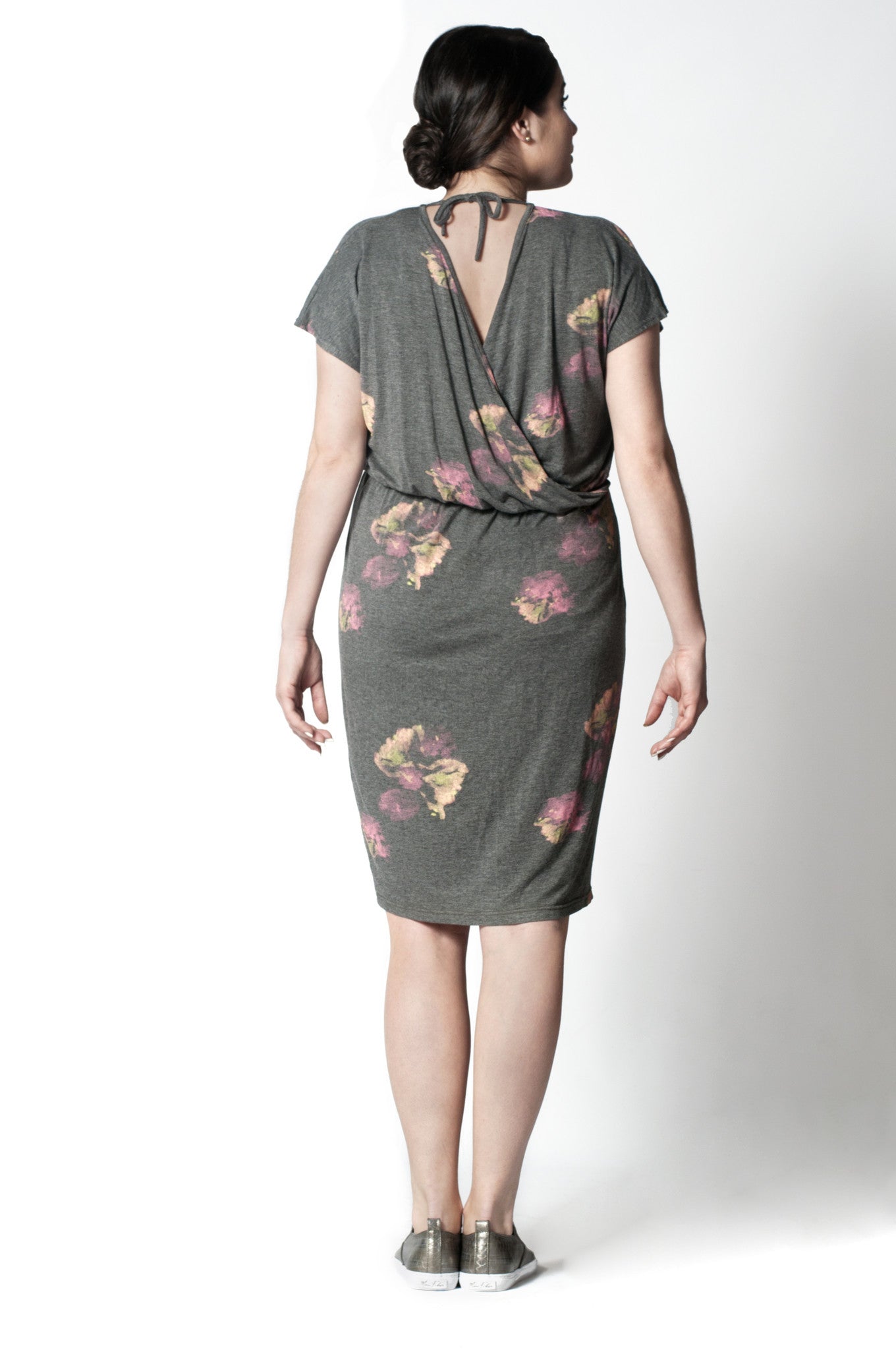 This casual cotton floral dress has an abstract pastel floral print. It is short sleeved, has a rounded neck and an open back. The back ties and can be adjusted to show more or less of your back.